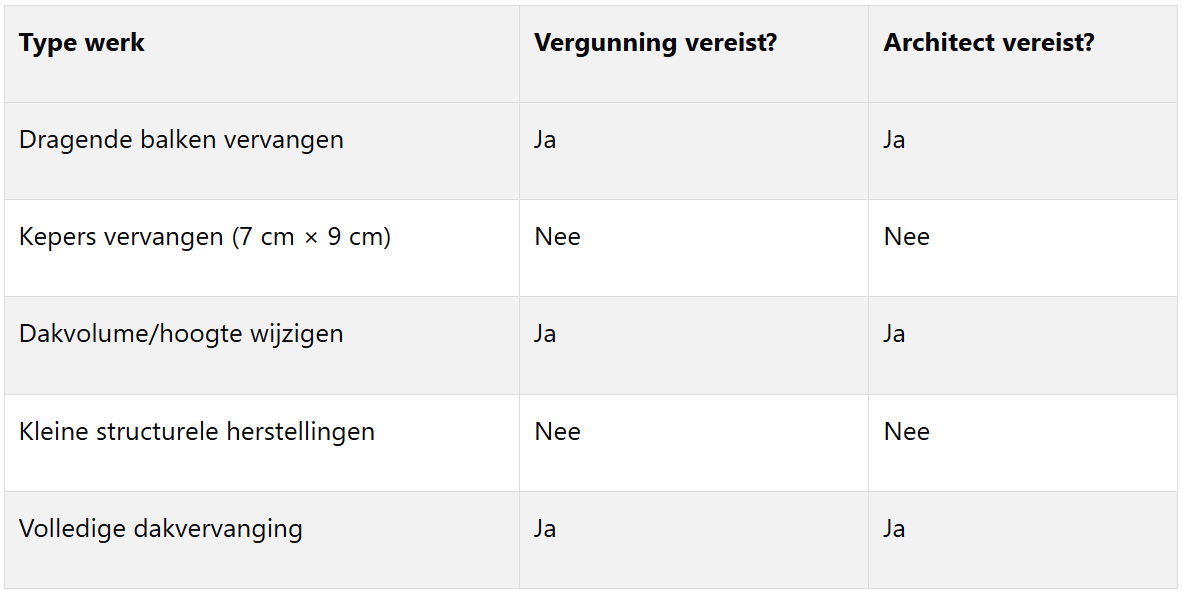 In België zijn vergunningen voor dakwerken afhankelijk van de regio (Vlaanderen, Wallonië, Brussel) en het type werkzaamheden. Structurele aanpassingen, zoals het verhogen van een dak of het vervangen van dragende balken, vereisen altijd een vergunning en vaak de tussenkomst van een architect. Onderhoudswerken, zoals het herstellen van kepers of vervangen van dakpannen, zijn meestal vergunningsvrij.